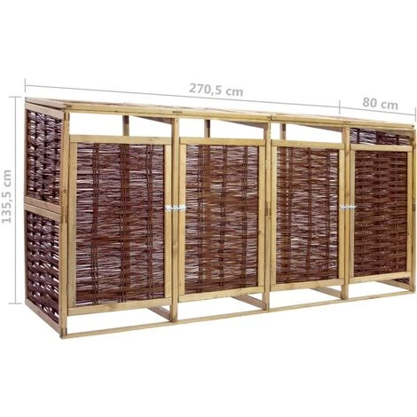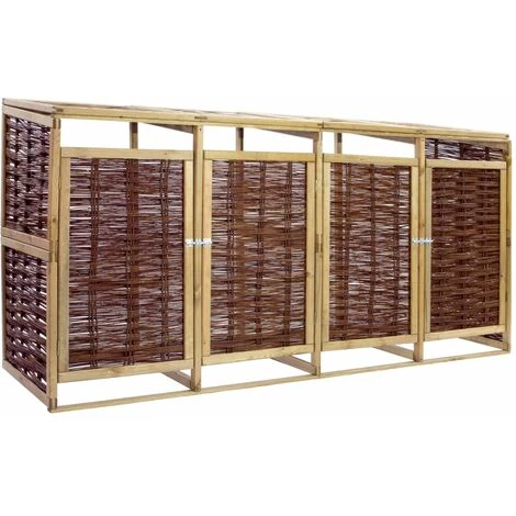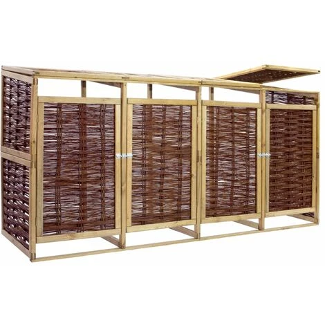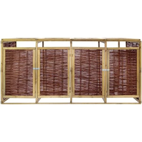 Cet abri en bois pour poubelles quadruple est idĂ©al pour cacher vos poubelles des regards dans le jardin. L’abri de stockage a quatre portes Ă ouverture individuelle Ă l’avant qui permet aux poubelles d’ĂŞtre facilement enlevĂ©es et vidĂ©es. Il est Ă©quipĂ© d’un verrou frontal pour maintenir la porte bien fermĂ©e. Cet abri de poubelle quadruple est fait de pinède et d’osier naturel, ce qui le rend non seulement rĂ©sistant aux intempĂ©ries, durable, mais ajoute Ă©galement un style rustique Ă votre espace de vie extĂ©rieur. Avec le matĂ©riel de montage inclus, le cache-poubelle est facile Ă assembler. Remarque : Les poubelles Ă roulettes ne sont pas incluses dans la livraison. Veuillez noter que le bois est un produit naturel pouvant prĂ©senter des imperfections.