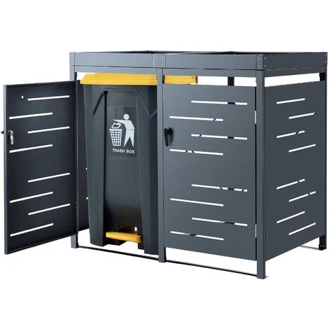 Ce box pour poubelle en acier galvanisĂ© est une solution parfaite pour abriter vos conteneurs de collecte de dĂ©chets des intempĂ©ries et de les envelopper discrètement. En outre, le revĂŞtement offre une protection idĂ©ale Ă vos poubelles, afin qu’elles ne soient pas soumises aux intempĂ©ries. Les portes sont verouillables.