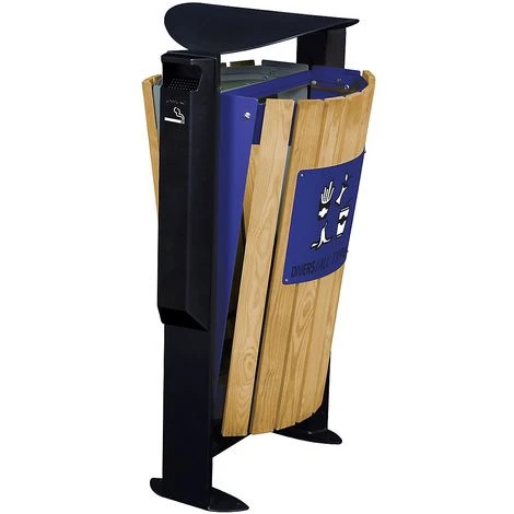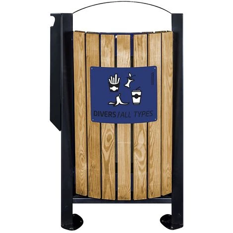 Acier traité anticorrosion Acier poudré anti-UVFaçade avec lattes traitées “autoclave“ : bois certifié “Classe 4“ (sans entretien) Ouverture par basculement de la façade vers l’avantVidage du cendrier par décrochageLivré avec 2 plaques de tri vissées avec stickers, pour fixation sur la façade