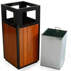 Poubelle urbaine de qualitĂ© professionnelle avec cendrier intĂ©grĂ©. La poubelle, de forme carrĂ©e, dispose d’une structure solide en acier noir, et de lattes en bois de hĂŞtre sur les cĂ´tĂ©s. Aussi Ă©lĂ©gante que solide, la poubelle carrĂ©e d’extĂ©rieur est conçue pour rĂ©sister Ă un usage intensif dans les espaces publics. Mesurant 80 cm de hauteur et 35 cm de largeur, la poubelle urbaine peut contenir jusqu’Ă 26 Litres. Le couvercle est amovible et incorpore un cendrier en acier inoxydable. La poubelle d’extĂ©rieur carrĂ©e est livrĂ©e avec 4 chevilles de fixation au sol. Chaque cĂ´tĂ© de la poubelle pro dispose de grandes ouvertures afin de faciliter l’accès au bac de rĂ©cupĂ©ration.