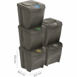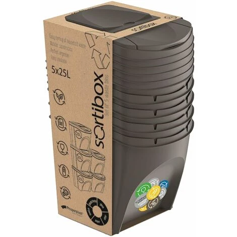 Lot de 5 bacs de recyclage de 25 litres de couleurs assorties pour papier, verre, plastique et organique.Le papier, le verre, le plastique ou le mĂ©tal rĂ©coltĂ©, soigneusement sĂ©parĂ© des dĂ©chets municipaux avec l’utilisation de solutions et d’accessoires modernes, devient une matière première prĂ©cieuse.Une attitude consciente, respectueuse de l’environnement et Ă©conomique n’a que des avantages : elle influe sur la limitation des dĂ©charges et l’utilisation rationnelle des ressources naturelles, en rĂ©duisant la pollution de l’air et de l’eau, en Ă©conomisant de l’Ă©nergie et en rĂ©duisant les coĂ»ts. Il est Ă©galement pratique et hygiĂ©nique pour une utilisation de l’espace de rangement qui est si prĂ©cieux Ă la maison.Sortibox rĂ©pond non seulement Ă ces exigences, mais fournit Ă©galement des capacitĂ©s de classification continue. Bien conçu, esthĂ©tique et spacieux (4 x 25 L), avec une structure spĂ©cialement conçue pour les espaces restreints, facilitant la disposition des segments en rangĂ©es ou poteaux stables.CapacitĂ© : 125 (25 x 5) litres. Dimensions : 39,2 x 29,3 x 33,5 cm (unitĂ©) 39,2 x 29,3 x 140 cm (empilĂ©s). Couleur : gris.