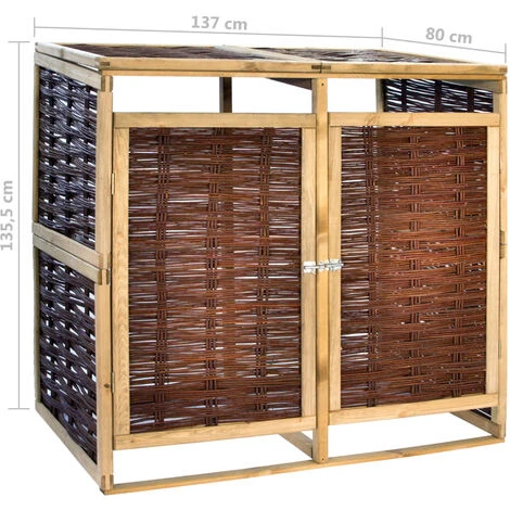 Cet abri en bois pour poubelles doubles est idĂ©al pour cacher vos poubelles des regards dans le jardin. L’abri de stockage a deux portes Ă ouverture individuelle Ă l’avant qui permet aux poubelles d’ĂŞtre facilement enlevĂ©es et vidĂ©es. Il est Ă©quipĂ© d’un verrou frontal pour maintenir la porte bien fermĂ©e. Cet abri de poubelle double est fait de pinède et d’osier naturel, ce qui le rend non seulement rĂ©sistant aux intempĂ©ries, durable, mais ajoute Ă©galement un style rustique Ă votre espace de vie extĂ©rieur. Avec le matĂ©riel de montage inclus, le cache-poubelle est facile Ă assembler. Remarque : Les poubelles Ă roulettes ne sont pas incluses dans la livraison. Veuillez noter que le bois est un produit naturel pouvant prĂ©senter des imperfections.